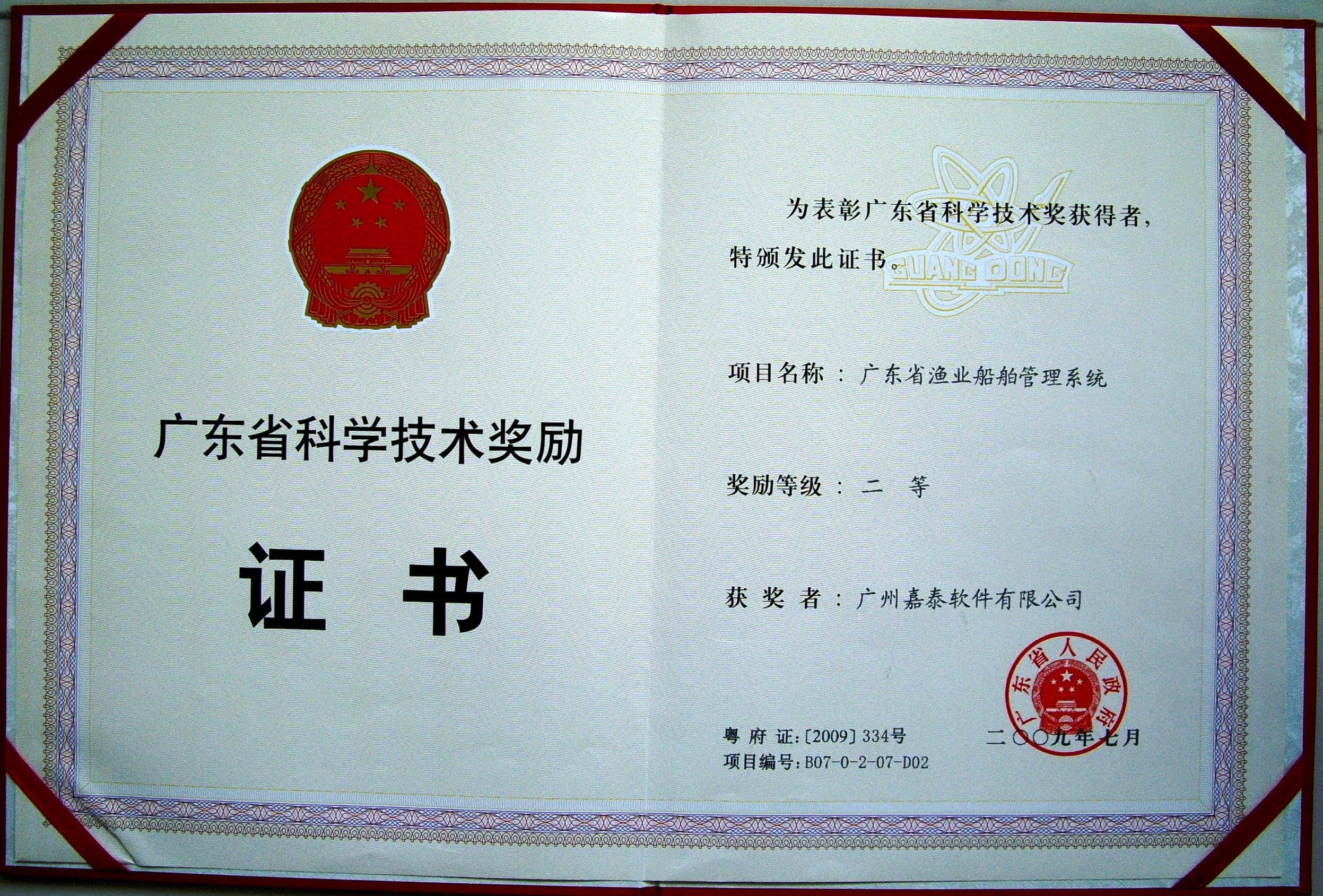 2009年 廣東省漁業(yè)船舶管理系統(tǒng)獲得2008年度廣東省科技進(jìn)步二等獎(jiǎng);